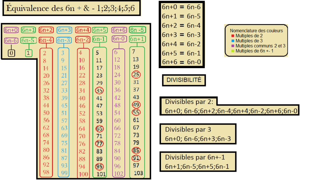 Donc tout les nombres premiers, supérieur à 3, sont de la forme 6 n+- 1et ne peuvent prendre place, qu’aux emplacements laissés vacants, par les nombres premiers précédents.