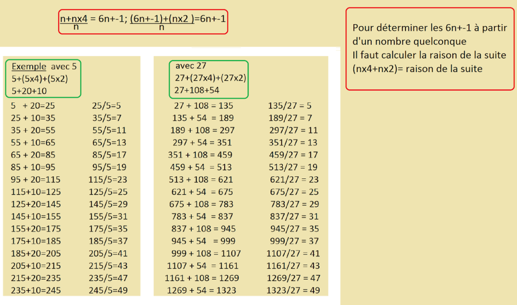 Lorsque la valeur de (n) est égal à 1, la suite obtenu, est la suite des 6n +- 1, la formule n + 4n + 2n, est la relation, qui relie les entiers naturels, à l’ensemble des 6n+- 1.